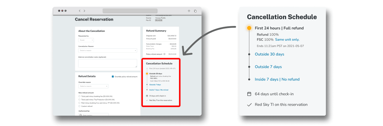 As a vacation rental management company, Vacasa lists units across many popular sites like AirBnB and Vrbo. Cancellation policy on each of these sites can be vastly different. When a guest would call Vacasa to cancel, it was confusing for customer service agents to know the refund eligibility. I was tasked with building a tool that quickly made that clear and was the sole Product Designer on this project.