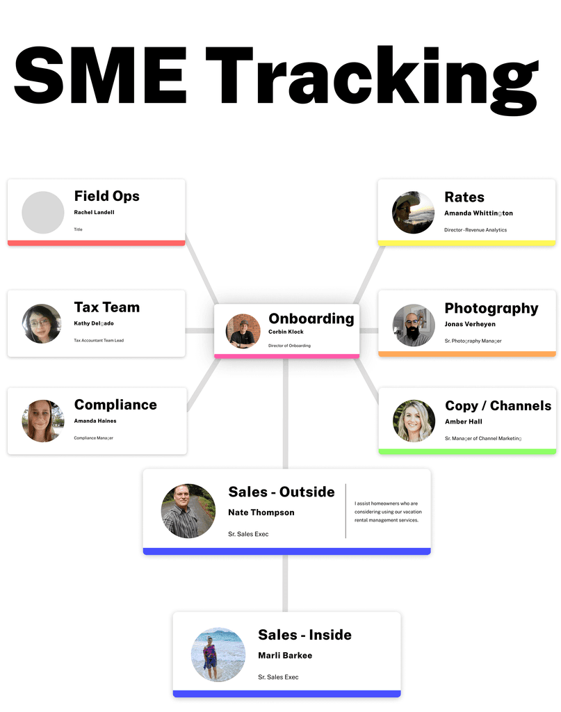 I conducted in depth interviews with 9 expert leaders throughout the onboarding pipeline. Within many of these interviews, I was granted an “over-the-shoulder” view of their team’s day-to-day reality. For each interview, I created a snapshot summary of each intersecting dependency, the delay-causing pain points their teams experience, and opportunities to mitigate those disruptions.