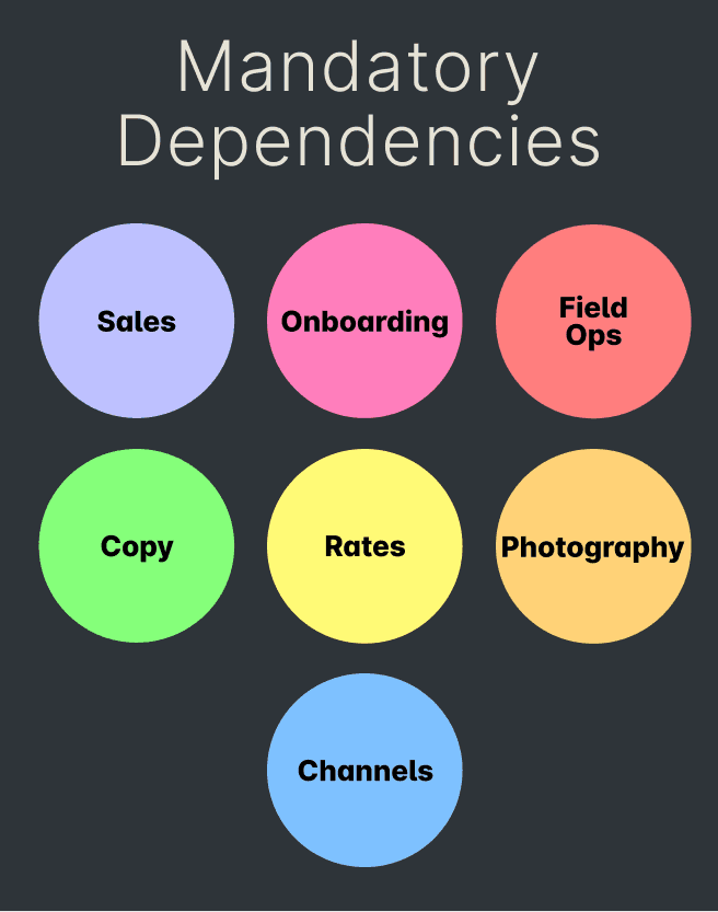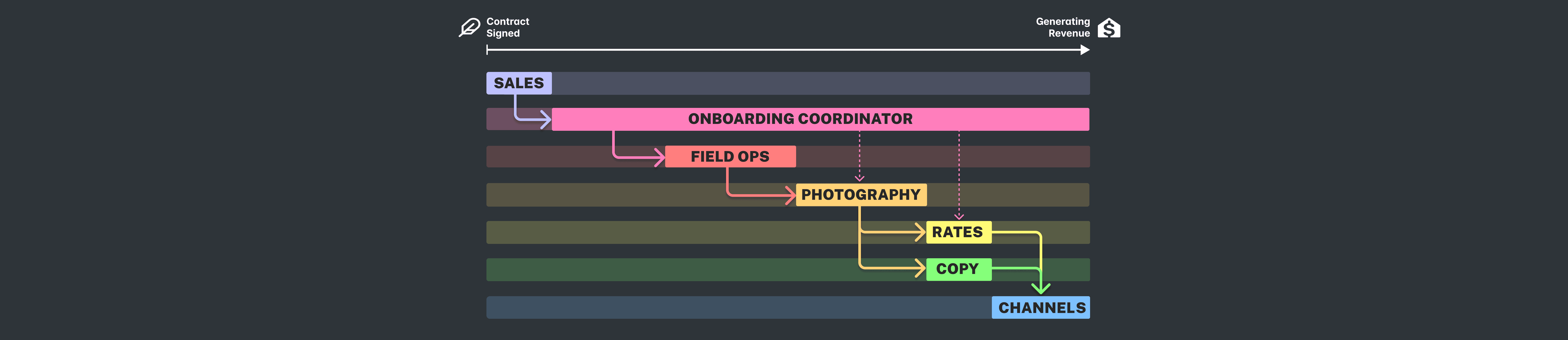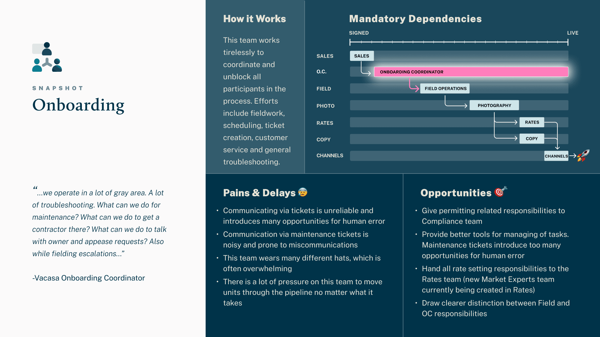 Vacasa is the largest vacation rental management company in the US. Thousands of new vacation rentals are onboarded every year. The process is inconsistent and fraught with delays among the dependencies. The goal of this project was to illustrate the dependencies for the business and uncover opportunities to optimize the "pipeline" while maintaining customer-centricity. My role was researcher.